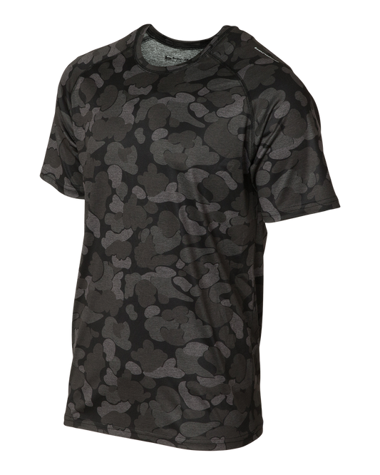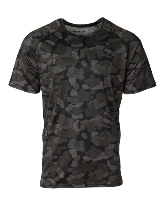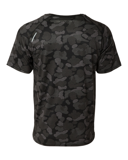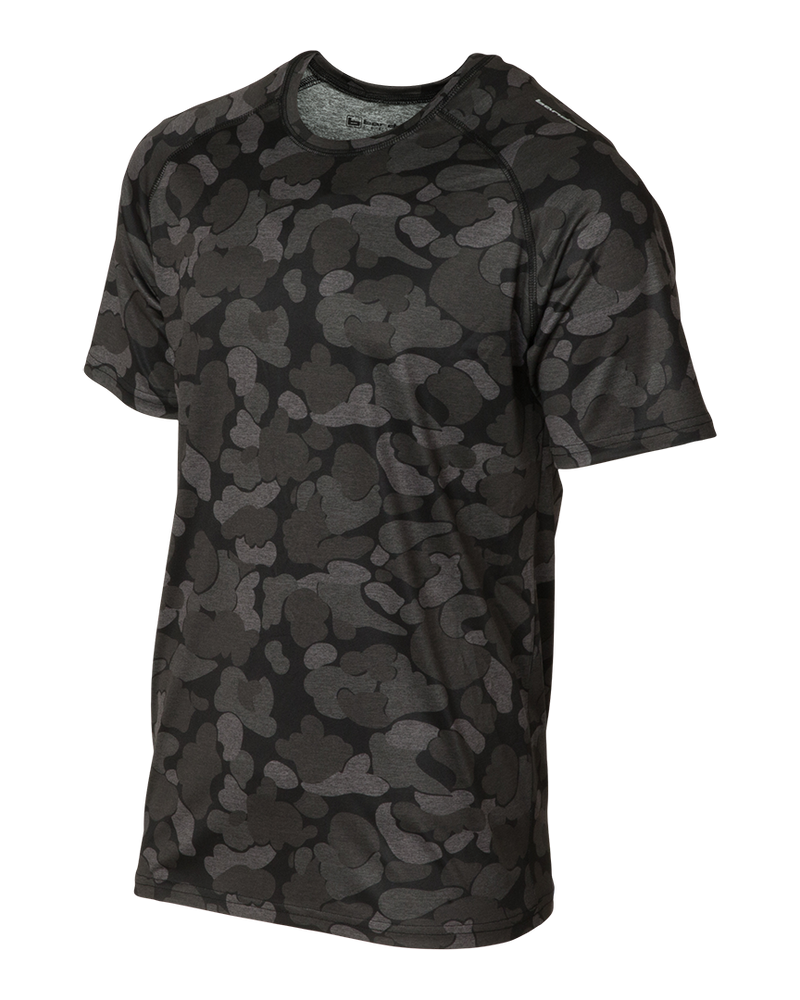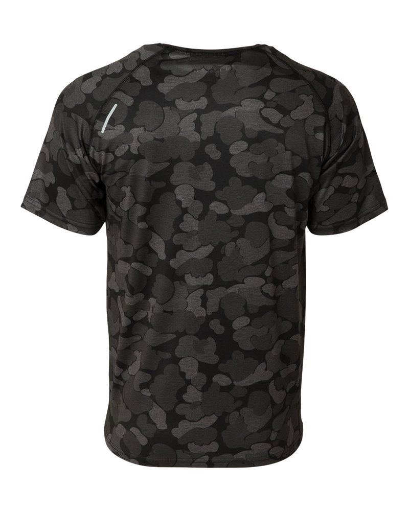 Do-anything performance with double-take style. Space-dyed and softened for an ultra-smooth textured pattern, and built with a moisture-shedding, quick-drying fabric. Injected with mobility-enhancing stretch. Strategic seam mapping with flatlock construction to minimize chaffing. Raglan sleeve design eliminates the top shoulder seam for comfortable layering. Reflective taping for nighttime visibility. Active fit.