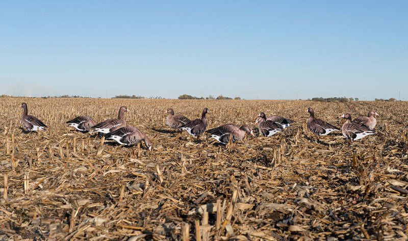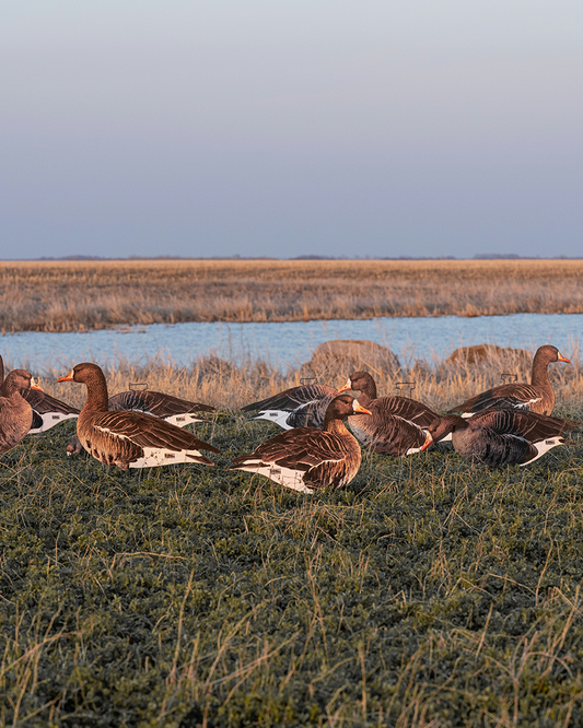 Pro-Grade Specklebelly Goose Decoys combine portability and durability into a highly effective and easy to deploy/store decoy system. Featuring attractive and unique postures with highly detailed photographic print to display lifelike movement and behavior. The matte-finish print absorbs light and reduces the risk of birds flaring from sun glare.