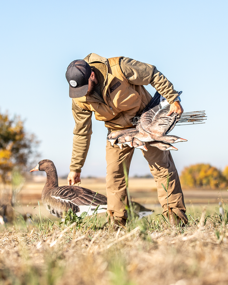 Pro Grade Snow Goose Silhouette Decoys combine portability and durability into a highly effective and easy to deploy/store decoy system. Featuring attractive and unique postures with highly detailed photographic print to display lifelike movement and behavior. The matte-finish print absorbs light and reduces the risk of birds flaring from sun glare.